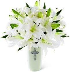 The Faithful Blessings Bouquet is an incredible way to celebrate a communion, confirmation, or wedding, as well as, send your sympathy for the loss of a loved one. Bringing together stems of fragrant Oriental Lilies, boasting multiple blooms on each stem to create a full and lush flower bouquet, this offering of flowers will bring peace and beauty to any of life's special moments and occasions. Presented in a keepsake designer white ceramic vase with a stunning cross on the front, this exquisite flower arrangement is exudes heartfelt blessings with each eye-catching, star-shaped lily. Lilies may arrive in various stages of development. The lily blooms will continue to open, extending arrangement life - and your recipient's enjoyment