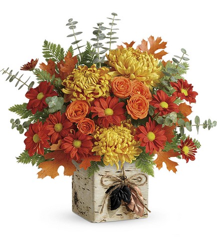 Celebrate fall's wild beauty with this rich autumnal bouquet! Presented in a rustic cube vase with unique birch tree finish, it's adorned with twine and stamped metal leaf charms, a true gift of the season! Approx. 16 W x 15 H