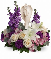 An elegantly unique expression of your deepest condolences, this majestic mix of crème, white and lavender blooms includes fragrant roses and lilies to refresh and rejuvenate their spirits. Nestled among the blooms is a graceful angel sculpture - a serene, spiritual keepsake they'll always treasure.