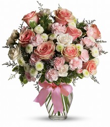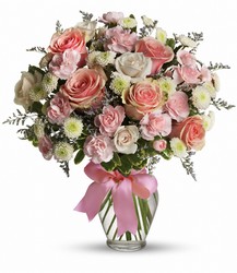 What a sweet way to celebrate the arrival of sugar and spice and everything nice! This pretty arrangement will delight any new mom or mom-to-be, that's for sure! Feminine flowers fill a charming ribbon-wrapped vase. It's a beautiful thing!
