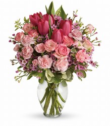 Spring into pink! Delicate roses, tulips and carnations fill a graceful vase with a cheerful expression of your love. It's affection perfection! Approx. 12 W x 14 1/2 H